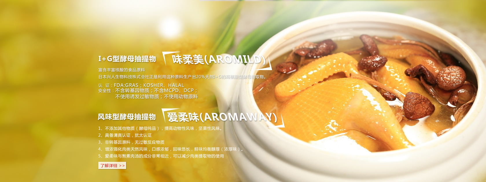 水解動植物蛋白系列(HVP&HAP) 復(fù)合調(diào)味料系列--酵母精、酵母抽提物 復(fù)合調(diào)味料系列--鮮味基礎(chǔ)調(diào)味料 復(fù)合調(diào)味料系列--海鮮風(fēng)味 復(fù)合調(diào)味料系列--畜禽風(fēng)味 復(fù)合調(diào)味料系列--和風(fēng)調(diào)味料 復(fù)合調(diào)味料系列--口酷味 復(fù)合調(diào)味料系列--餐飲外食 味淋料酒 可得然凝膠G 面包預(yù)拌粉 面包改良劑